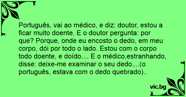 Português, vai ao médico, e diz: doutor, estou a ficar muito doente. E o doutor pergunta: por que? Porque, onde eu encosto o dedo, em meu corpo, dói por todo o lado. Estou com o corpo todo doente, e doído.... E o médico,estranhando, disse: deixe-me examinar o seu dedo....(o português, estava com o dedo quebrado)..