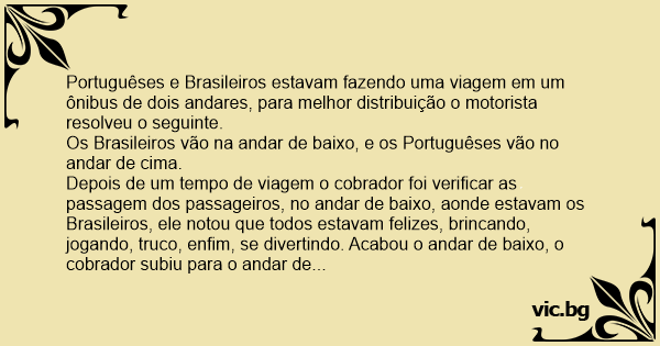 Depois de um tempo de viagem o cobrador foi verificar as passagem dos passageiros, no andar de baixo, aonde estavam os Brasileiros, ele notou que todos estavam felizes, brincando, jogando, truco, enfim, se divertindo. Acabou o andar de baixo, o cobrador subiu para o andar de cima, aonde estavam os Portuguêses, e notou que todos estavam resando silenciosamente, curioso com a situação o cobrador interrompe um Português e pergunta para ele: _ Mais porquê vocês estão resando?