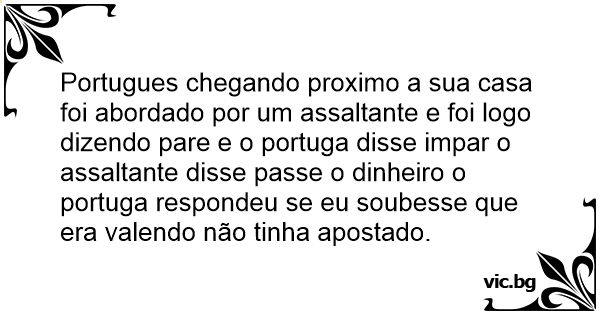 Portugues chegando proximo a sua casa foi abordado por um assaltante e foi logo dizendo pare e o portuga disse impar o assaltante disse passe o dinheiro o portuga respondeu se eu soubesse que era valendo não tinha apostado.