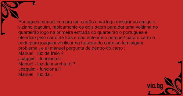 Portugues manuel compra um carrão e vai logo mostrar ao amigo e vizinho joaquim, rapidamente os dois saem para dar uma voltinha no quarteirão logo na primeira entrada do quarteirão o portugues é ofendido pelo carro de trás e não entende o porque? pára o carro e pede para joaquim verificar na traseira do carro se tem algum problema , e ai manuel pergunta de dentro do carro :