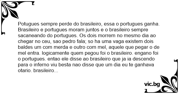 Brasileiro e portugues moram juntos e o brasileiro sempre sacaneando do portugues. Os dois morrem no mesmo dia ao chegar no ceu, sao pedro fala; so ha uma vaga existem dois baldes um com меrdа e outro com mel, aquele que pegar o de mel entra. logicamente quem pegou foi o brasileiro. engano foi o portugues. entao ele disse ao brasileiro que ja ia descendo para o inferno viu besta nao disse que um dia eu te ganhava otario. brasileiro disse: e mais em compensaçao depois sao pedro mandou um lamber o o outro.