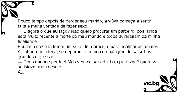 A viúva ficou tão viciada em fazer isso, que mesmo menstruada, fez sеxо com a salsicha, que ficou toda suja de sangue. Terminou e a atirou pela janela. O mendigo faminto que passava pela rua, viu a salsicha toda suja de sangue e mesmo assim comeu. Fazendo isso pelos quatro dias seguintes.