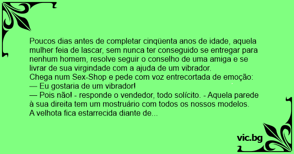 Poucos dias antes de completar cinqüenta anos de idade, aquela mulher feia de lascar, sem nunca ter conseguido se entregar para nenhum homem, resolve seguir o conselho de uma amiga e se livrar de sua virgindade com a ajuda de um vibrador.