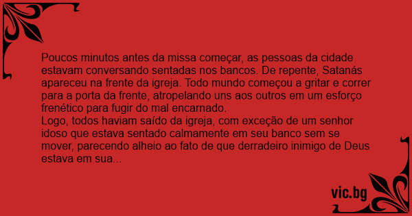 Logo, todos haviam saído da igreja, com exceção de um senhor idoso que estava sentado calmamente em seu banco sem se mover, parecendo alheio ao fato de que derradeiro inimigo de Deus estava em sua presença.