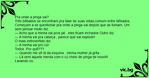 Três bêbados se encontram pra falar de suas vidas,comum entre bêbados. Começam a se questionar pra onde a pinga vai depois que as tomam. Um sem pensar muito diz: