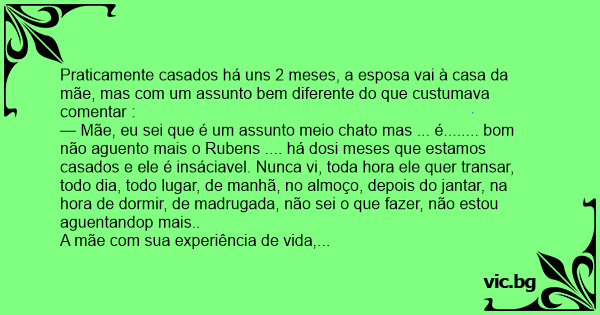 — Mãe, eu sei que é um assunto meio chato mas ... é........ bom não aguento mais o Rubens .... há dosi meses que estamos casados e ele é insáciavel. Nunca vi, toda hоrа ele quer transar, todo dia, todo lugar, de manhã, no almoço, depois do jantar, na hоrа de dormir, de madrugada, não sei o que fazer, não estou aguentandop mais..