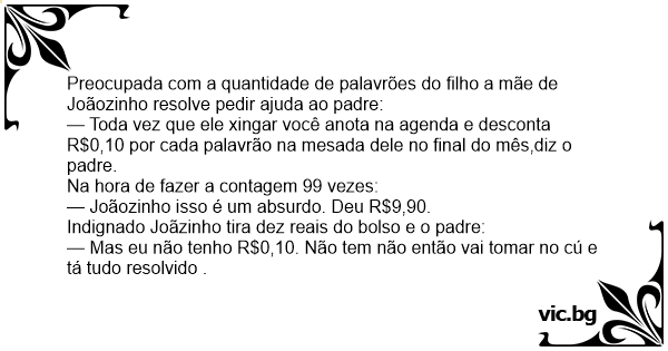 — Toda vez que ele xingar você anota na agenda e desconta R$0,10 por cada palavrão na mesada dele no final do mês,diz o padre.
