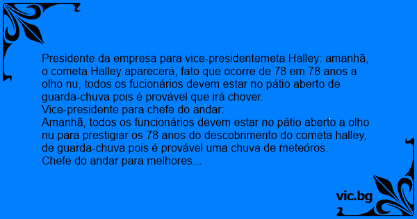 Presidente da empresa para vice-presidentemeta Halley: amanhã, o cometa Halley aparecerá, fato que ocorre de 78 em 78 anos a olho nu, todos os fucionários devem estar no pátio aberto de guarda-chuva pois é provável que irá chover.