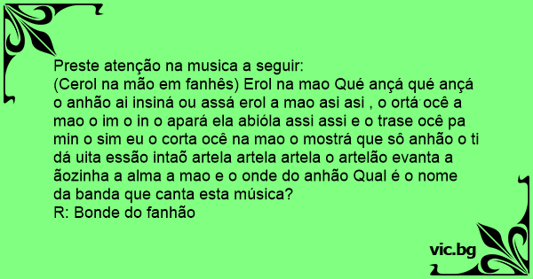 (Cerol na mão em fanhês) Erol na mao Qué ançá qué ançá o anhão ai insiná ou assá erol a mao asi asi , o ortá ocê a mao o im o in o apará ela abióla assi assi e o trase ocê pa min o sim eu o corta ocê na mao o mostrá que sô anhão o ti dá uita essão intaõ artela artela artela o artelão evanta a ãozinha a alma a mao e o onde do anhão Qual é o nome da banda que canta esta música?