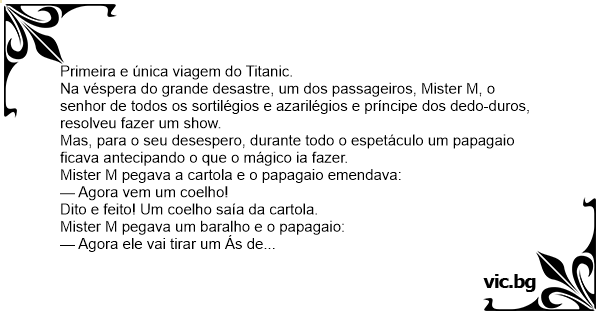 Titaniğin salonlarından birinde her akşam bir sihirbaz gösteri yapıyormuş. Adam gerçekten çok ustaymış ama bir sorunu varmış. Salonun bir köşesinde bulunan papağan, tam ne sihirdir ne keramet...