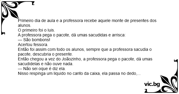 Então chegou a vez do Joãozinho, a professora pega o pacote, dá umas sacudidelas e não ouve nada.