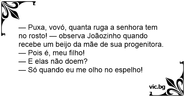 — Puxa, vovó, quanta ruga a senhora tem no rosto! — observa Joãozinho quando recebe um beijo da mãe de sua progenitora.