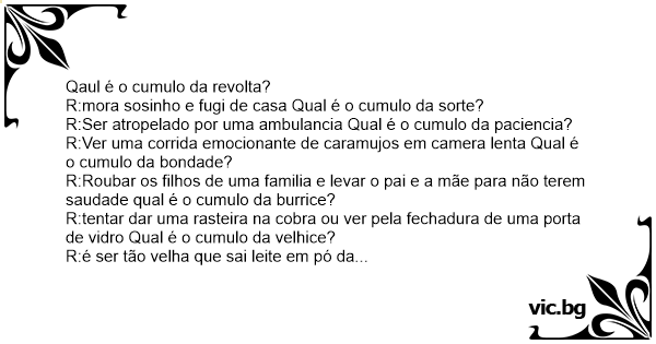 R:Ver uma corrida emocionante de caramujos em camera lenta Qual é o cumulo da bondade?