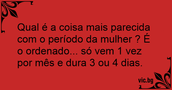 Qual é a coisa mais parecida com o período da mulher ? É o ordenado... só vem 1 vez por mês e dura 3 ou 4 dias.