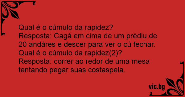 Resposta: Cagá em cima de um prédiu de 20 andáres e descer para ver o cú fechar.