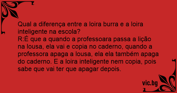 R:É que a quando a professoara passa a lição na lousa, ela vai e copia no caderno, quando a professora apaga a lousa, ela ela também apaga do caderno. E a loira inteligente nem copia, pois sabe que vai ter que apagar depois.