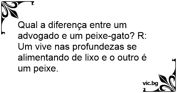 Qual a diferença entre um advogado e um peixe-gato? R: Um vive nas profundezas se alimentando de lixo e o outro é um peixe.