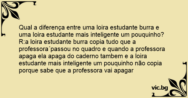 R:a loira estudante burra copia tudo que a professora´passou no quadro e quando a professora apaga ela apaga do caderno tambem e a loira estudante mais inteligente um pouquinho não copia porque sabe que a professora vai apagar