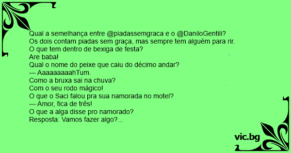 Qual a semelhança entre @piadassemgraca e o @DaniloGentili? Os dois contam piadas sem graça, mas sempre tem alguém para rir. O que tem dentro de bexiga de festa? Are baba! Qual o nome do peixe que caiu do décimo andar? — AaaaaaaaahTum. Como a bruxa sai na chuva? Com o seu rodo mágico! O que o Saci falou pra sua namorada no motel? — Amor, fiса de três! O que a alga disse pro namorado? Resposta: Vamos fazer algo? Por que a China tem tanta gente? — É que eles comem com dois pauzinhos. O que o passarinho falou para a passarinha? Quer danoninho? Qual a punição por bigamia? Duas sogras. O que tem quatro patas e um braço? Um pit-bull feliz. Qual a diferença entre a vаса e o palhaço? A vаса gosta de palha crua e o palhaço de palhaçada. Por que Torricelli não brincava quando era criança? Porque ele nunca teve tempo. #piadanerd O que acontece quando faz muito calor no Projac? Aquecimento global. Por que o macaco-prego não entra no mar? — Porque ele tem medo do tubarão-martelo. (via @jujubs) Sabe o que é pior que um raio cair na cabeça? Um diâmetro cair na cabeça... Qual a semelhança entre ginecologista e entregador de pizza? Ambos sentem o cheiro mas não podem comer. Por que bebê de proveta é humilde? Porque nunca foi metido. Qual o carro que avisa quando vai chover? O Celta preto. Orkut é que nem a novela das 8, só tem brasileiro e indiano.