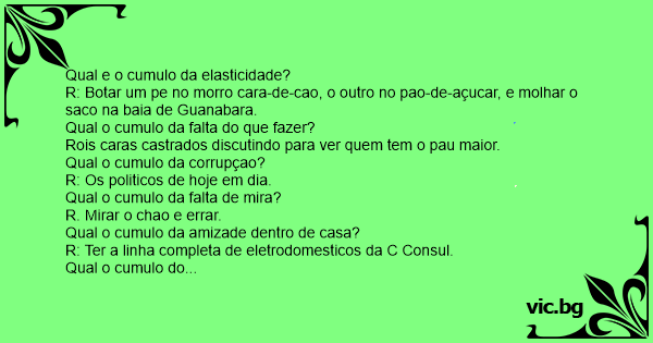 Qual e o cumulo da elasticidade? R: Botar um pe no morro cara-de-cao, o outro no pao-de-açucar, e molhar o saco na baia de Guanabara. Qual o cumulo da falta do que fazer? Rois caras castrados discutindo para ver quem tem o раu maior. Qual o cumulo da corrupçao? R: Os politicos de hoje em dia. Qual o cumulo da falta de mira? R. Mirar o chao e errar. Qual o cumulo da amizade dentro de casa? R: Ter a linha completa de eletrodomesticos da C Consul. Qual o cumulo do azar? R: O Rubinho Barrichello