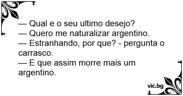 — Qual e o seu ultimo desejo? — Quero me naturalizar argentino. — Estranhando, por que? - pergunta o carrasco. — E que assim morre mais um argentino.