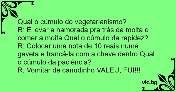 R: É levar a namorada pra trás da moita e comer a moita Qual o cúmulo da rapidez?