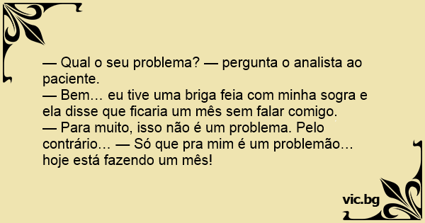 — Bem… eu tive uma briga feia com minha sogra e ela disse que ficaria um mês sem falar comigo.