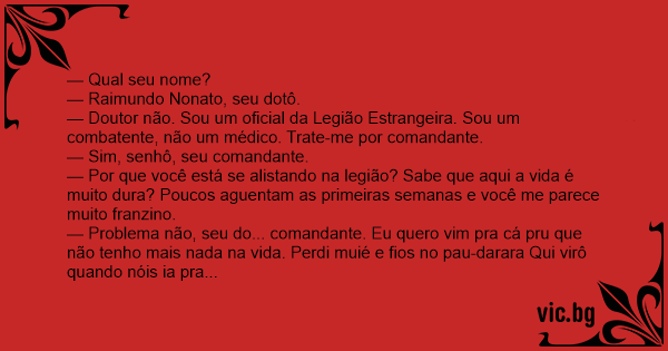 — Doutor não. Sou um oficial da Legião Estrangeira. Sou um combatente, não um médico. Trate-me por comandante.