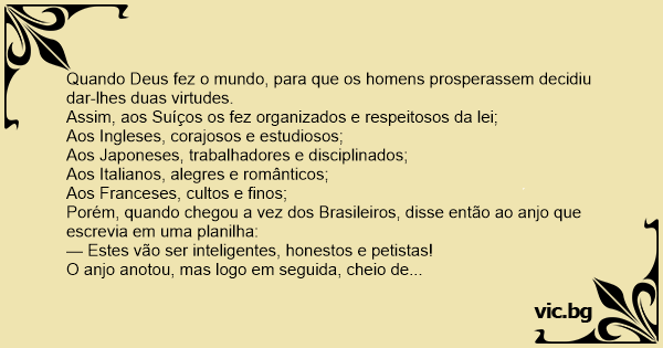 — Senhor, a todos os povos do mundo foram dadas duas virtudes, porém, aos brasileiros, foram dadas três! Isto não os fará soberbos em relação aos outros povos da Terra?