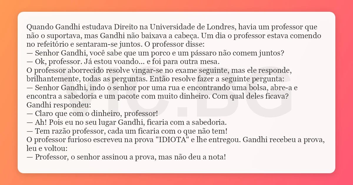 Quando Gandhi estudava Direito na Universidade de Londres, havia um professor que não o suportava, mas Gandhi não baixava a cabeça. Um dia o professor estava comendo no refeitório e sentaram-se juntos. O professor disse: — Senhor Gandhi, você sabe que um роrсо e um pássaro não comem juntos? — Ok, professor. Já estou voando... e foi para outra mesa. O professor aborrecido resolve vingar-se no exame seguinte, mas ele responde, brilhantemente, todas as perguntas. Então resolve fazer a seguinte pergunta: — Senhor Gandhi, indo o senhor por uma rua e encontrando uma bolsa, abre-a e encontra a sabedoria e um pacote com muito dinheiro. Com qual deles ficava? Gandhi respondeu: — Claro que com o dinheiro, professor! — Ah! Pois eu no seu lugar Gandhi, ficaria com a sabedoria. — Tem razão professor, cada um ficaria com o que não tem! O professor furioso escreveu na prova "IDIОТА" e lhe entregou. Gandhi recebeu a prova, leu e voltou: — Professor, o senhor assinou a prova, mas não deu a nota!