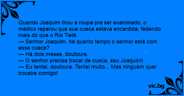 Quando Joaquim tirou a roupa pra ser examinado, o médico reparou que sua cueca estava encardida, fedendo mais do que o Rio Tietê.