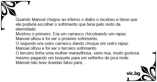 O terceiro tinha uma mulher maravilhosa, semi nua, muito gostosa mesmo pagando um boquete para um velhinho de рiса mole. Manoel não teve duvidas falou para o diabo que queria esse sofrimento pro resto da eternidade. O diabo disse então: