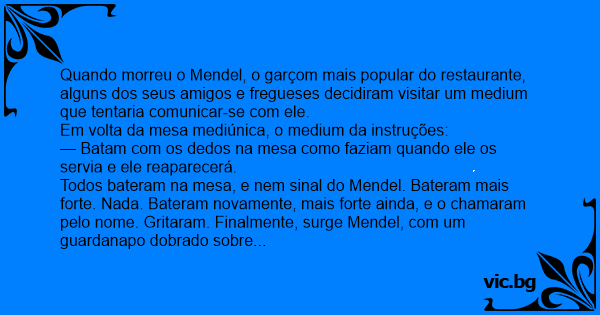 Todos bateram na mesa, e nem sinal do Mendel. Bateram mais forte. Nada. Bateram novamente, mais forte ainda, e o chamaram pelo nome. Gritaram. Finalmente, surge Mendel, com um guardanapo dobrado sobre o braço, cara de contrariedade.