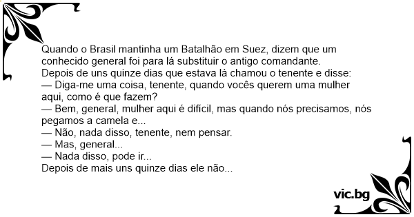 — Bem, general, mulher aqui é difícil, mas quando nós precisamos, nós pegamos a camela e...