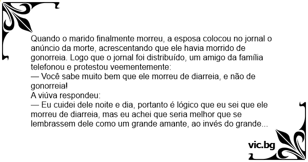 Quando o marido finalmente morreu, a esposa colocou no jornal o anúncio da morte, acrescentando que ele havia morrido de gonorreia. Logo que o jornal foi distribuído, um amigo da família telefonou e protestou veementemente:
