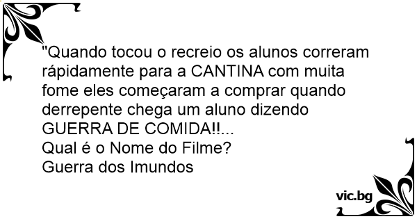 "Quando tocou o recreio os alunos correram rápidamente para a CANTINA com muita fome eles começaram a comprar quando derrepente chega um aluno dizendo GUERRA DE COMIDA!!...