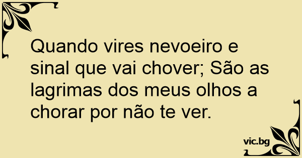Quando vires nevoeiro e sinal que vai chover; São as lagrimas dos meus olhos a chorar por não te ver.