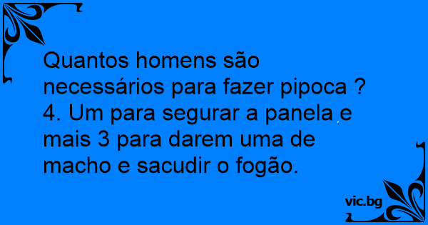 Quantos homens são necessários para fazer pipoca ? 4. Um para segurar a panela e mais 3 para darem uma de macho e sacudir o fogão.