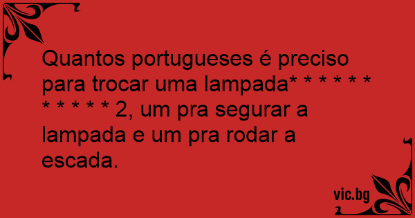 Quantos portugueses é preciso para trocar uma lampada* * * * * * * * * * * 2, um pra segurar a lampada e um pra rodar a escada.