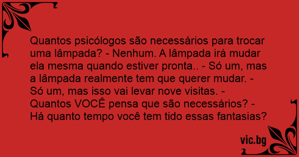 Quantos psicólogos são necessários para trocar uma lâmpada? - Nenhum. A lâmpada irá mudar ela mesma quando estiver pronta.. - Só um, mas a lâmpada realmente tem que querer mudar. - Só um, mas isso vai levar nove visitas. - Quantos VOCÊ pensa que são necessários? - Há quanto tempo você tem tido essas fantasias?