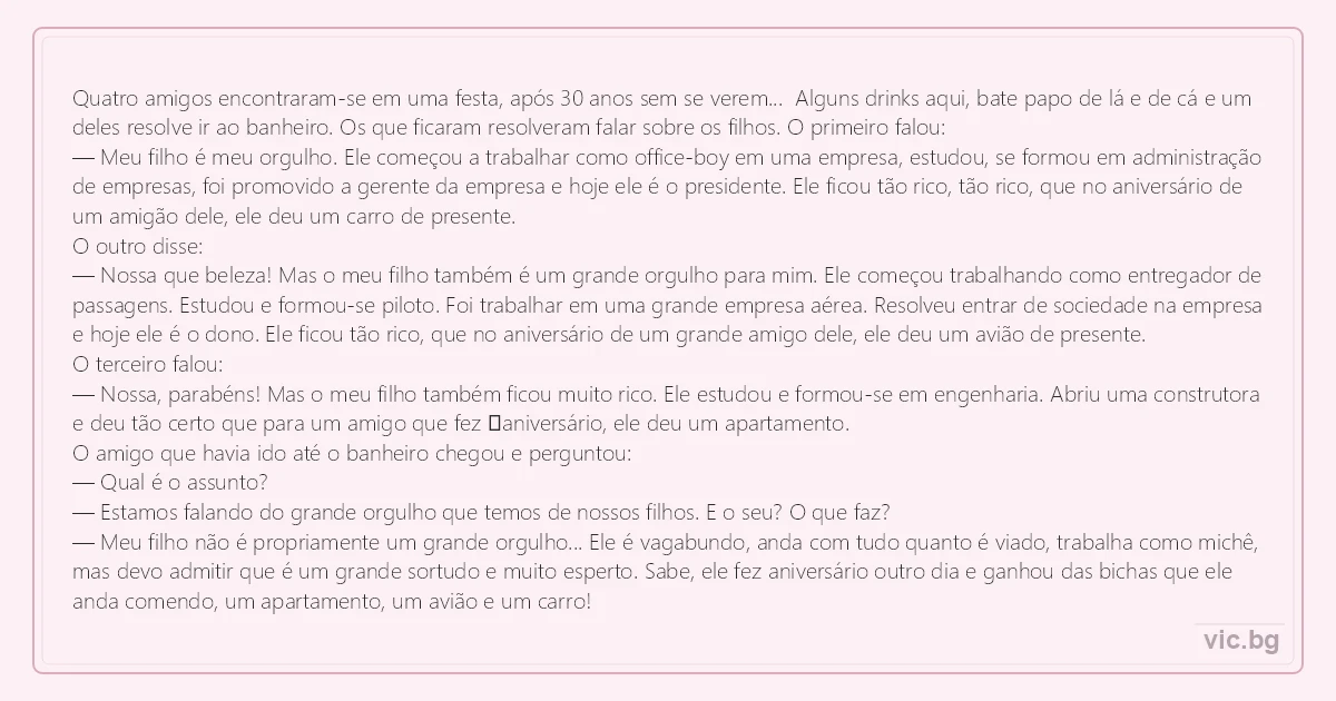 Quatro amigos encontraram-se em uma festa, após 30 anos sem se verem... Alguns drinks aqui, bate papo de lá e de cá e um deles resolve ir ao banheiro. Os que ficaram resolveram falar sobre os filhos. O primeiro falou: — Meu filho é meu orgulho. Ele começou a trabalhar como office-boy em uma empresa, estudou, se formou em administração de empresas, foi promovido a gerente da empresa e hoje ele é o presidente. Ele ficou tão rico, tão rico, que no aniversário de um amigão dele, ele deu um carro de presente. O outro disse: — Nossa que beleza! Mas o meu filho também é um grande orgulho para mim. Ele começou trabalhando como entregador de passagens. Estudou e formou-se piloto. Foi trabalhar em uma grande empresa aérea. Resolveu entrar de sociedade na empresa e hoje ele é o dono. Ele ficou tão rico, que no aniversário de um grande amigo dele, ele deu um avião de presente. O terceiro falou: — Nossa, parabéns! Mas o meu filho também ficou muito rico. Ele estudou e formou-se em engenharia. Abriu uma construtora e deu tão certo que para um amigo que fez aniversário, ele deu um apartamento. O amigo que havia ido até o banheiro chegou e perguntou: — Qual é o assunto? — Estamos falando do grande orgulho que temos de nossos filhos. E o seu? O que faz? — Meu filho não é propriamente um grande orgulho... Ele é vаgавundо, anda com tudo quanto é viаdо, trabalha como michê, mas devo admitir que é um grande sortudo e muito esperto. Sabe, ele fez aniversário outro dia e ganhou das bichas que ele anda comendo, um apartamento, um avião e um carro!