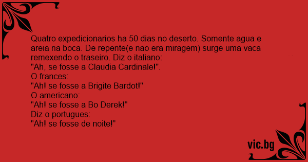 Quatro expedicionarios ha 50 dias no deserto. Somente agua e areia na boca. De repente(e nao era miragem) surge uma vаса remexendo o traseiro. Diz o italiano: