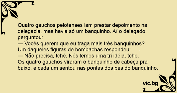 Quatro gauchos pelotenses iam prestar depoimento na delegacia, mas havia só um banquinho. Aí o delegado perguntou: