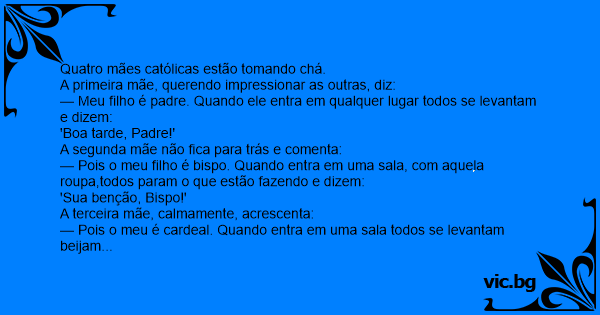 — Pois o meu filho é bispo. Quando entra em uma sala, com aquela roupa,todos param o que estão fazendo e dizem: