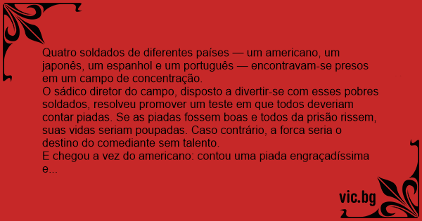 Quatro soldados de diferentes países — um americano, um japonês, um espanhol e um português — encontravam-se presos em um campo de concentração.