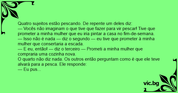 — Vocês não imaginam o que tive que fazer para vir pescar! Tive que prometer a minha mulher que eu iria pintar a casa no fim-de-semana.
