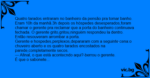 Quatro tarados entraram no banheiro da pensão pra tomar banho. Eram 10h da manhã.3h depois os hòspedes desesperados,foram chamar o gerente pra reclamar que a porta do banheiro continuava fechada. O gerente grito,gritou,ninguèm respondeu la dentro. Então resouveram arrombar a porta.