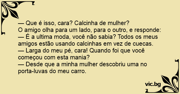 — É a ultima moda, você não sabia? Todos os meus amigos estão usando calcinhas em vez de cuecas.