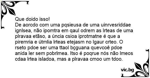 De aorcdo com uma pqsieusa de uma uinrvesriddae ignlsea, não ipomtra em qaul odrem as lrteas de uma plravaa etãso, a úncia csioa iprotmatne é que a piremria e útmlia lrteas etejasm no lgaur crteo. O rseto pdoe ser uma ttaol bçguana quevcoê pdoe anida ler sem pobrlmea. Itso é poqrue nós não lmeos cdaa lrtea isladoa, mas a plravaa cmoo um tdoo.