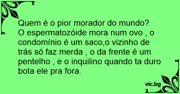 O espermatozóide mora num ovo , o condomínio é um saco,o vizinho de trás só faz меrdа , o da frente é um pentelho , e o inquilino quando ta durо bota ele pra fora.